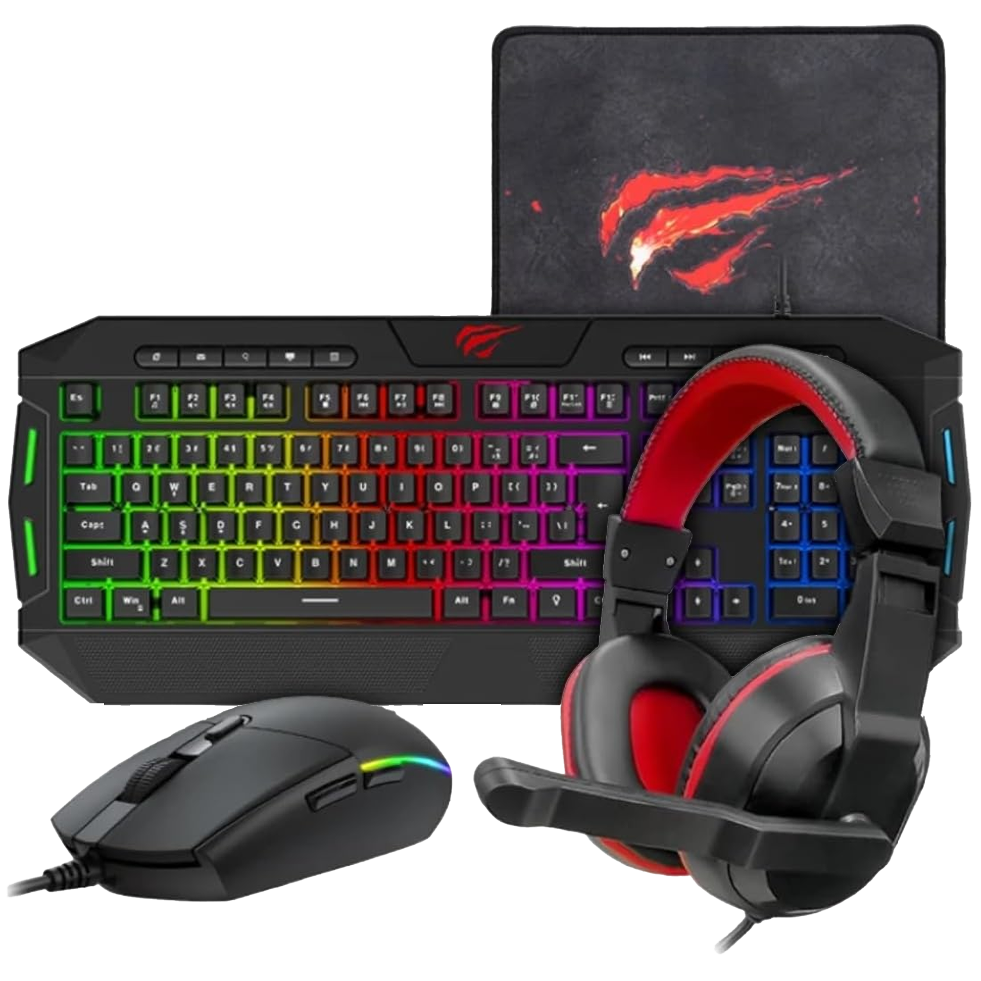 - HAVIT 4-in-1 Wired Gaming Combo RGB Backlit Keyboard (114 Keys), 6-Button Mouse (800–2400 DPI), 3.5mm Headset with Mic, Fine-Mesh Mouse Pad – PC, Mac, Laptop Compatible Black - فأرة, حصيرة فأرة, سماعة, لوحة مفاتيح HAVIT 4-in-1 Wired Gaming Combo RGB Backlit Keyboard (114 Keys), 6-Button Mouse (800–2400 DPI), 3.5mm Headset with Mic, Fine-Mesh Mouse Pad – PC, Mac, Laptop Compatible Black - فأرة, حصيرة فأرة, سماعة, لوحة مفاتيح