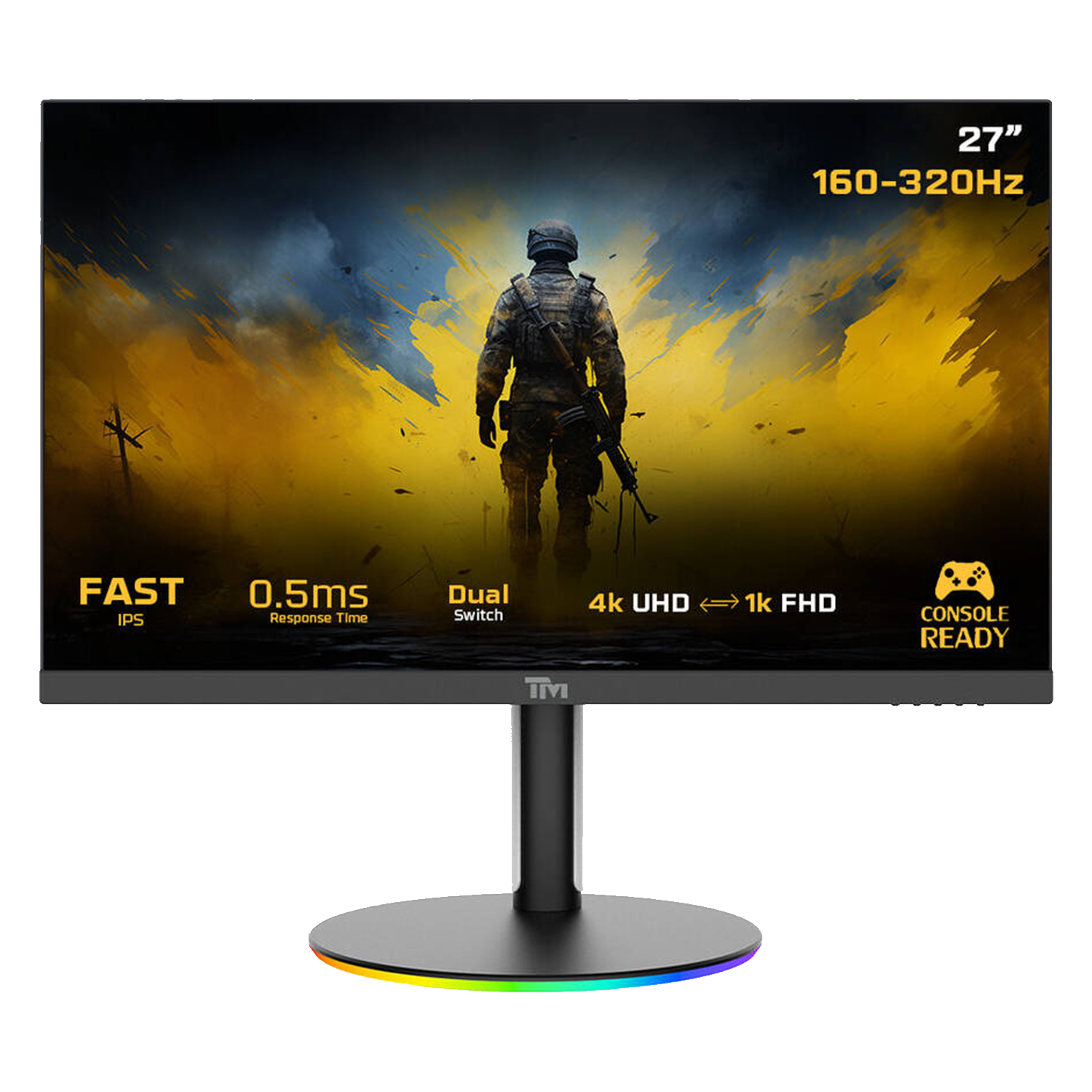 Twistedminds Dual Switch Gaming Monitor 27" Inch UHD/FHD 160Hz/320Hz IPS Display, 0.5ms Response Time, HDMI, HDR10, G-Sync, FreeSync, Tilt, Swivel, Supports PS5, RGB Base, Speakers, Black | TMDX27B