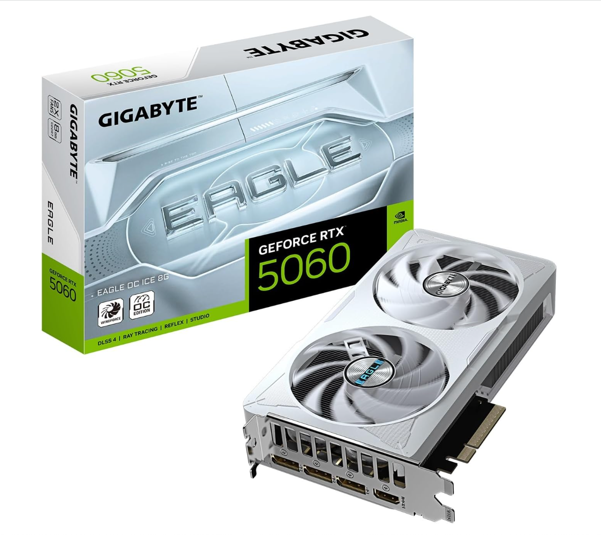 - GIGABYTE GeForce RTX 5060 Eagle OC ICE 8GB Graphics Card, GDDR7, PCIe 5.0, WINDFORCE Cooling System, White - كرت شاشه أبيض GIGABYTE GeForce RTX 5060 Eagle OC ICE 8GB Graphics Card, GDDR7, PCIe 5.0, WINDFORCE Cooling System, White - كرت شاشه أبيض