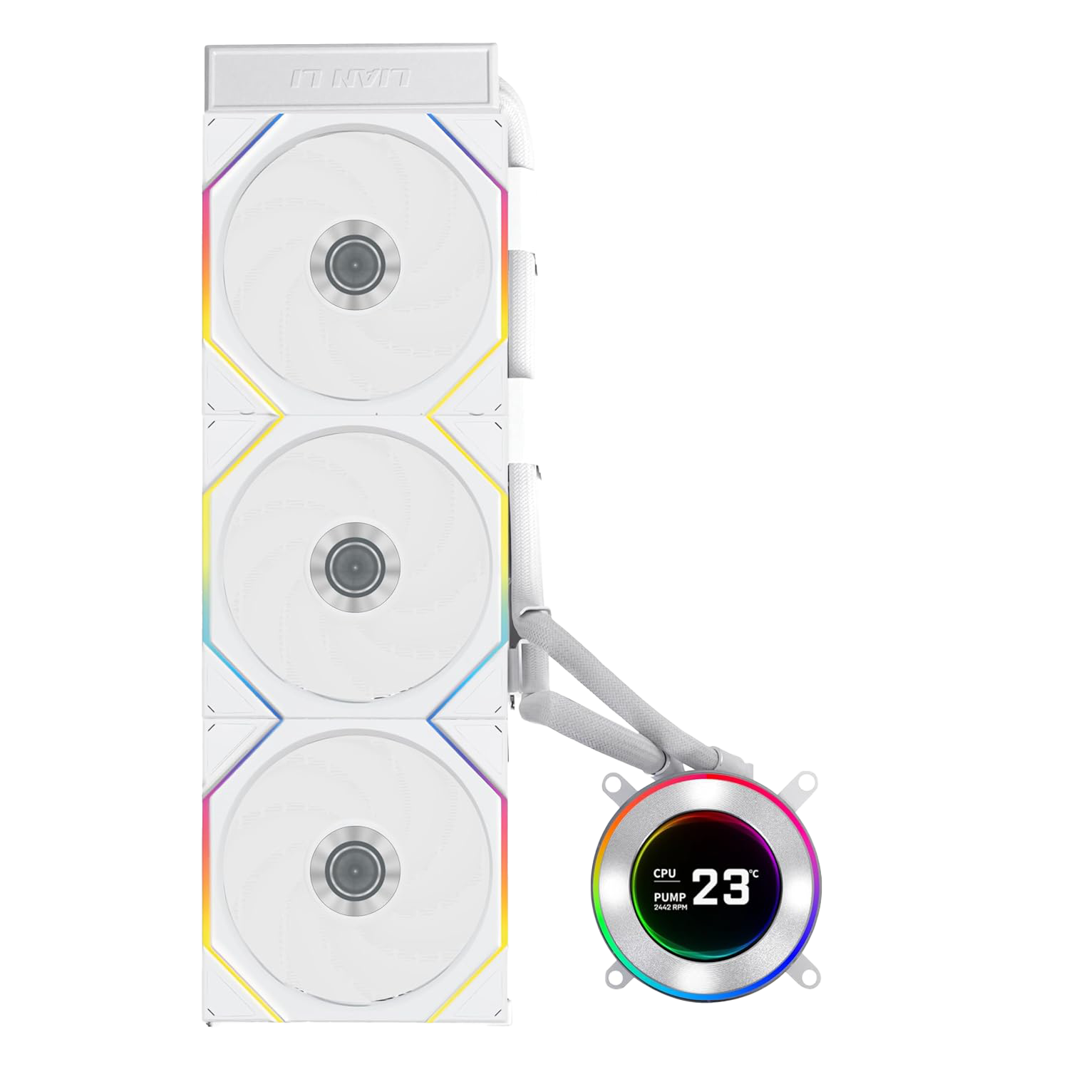 • Lian Li Hydroshift II-C 360TL RGB Liquid Cooler with IPS LCD Screen TL Wireless fans White - مبرد مائي أبيض مع شاشه Lian Li Hydroshift II-C 360TL RGB Liquid Cooler with IPS LCD Screen TL Wireless fans White - مبرد مائي أبيض مع شاشه