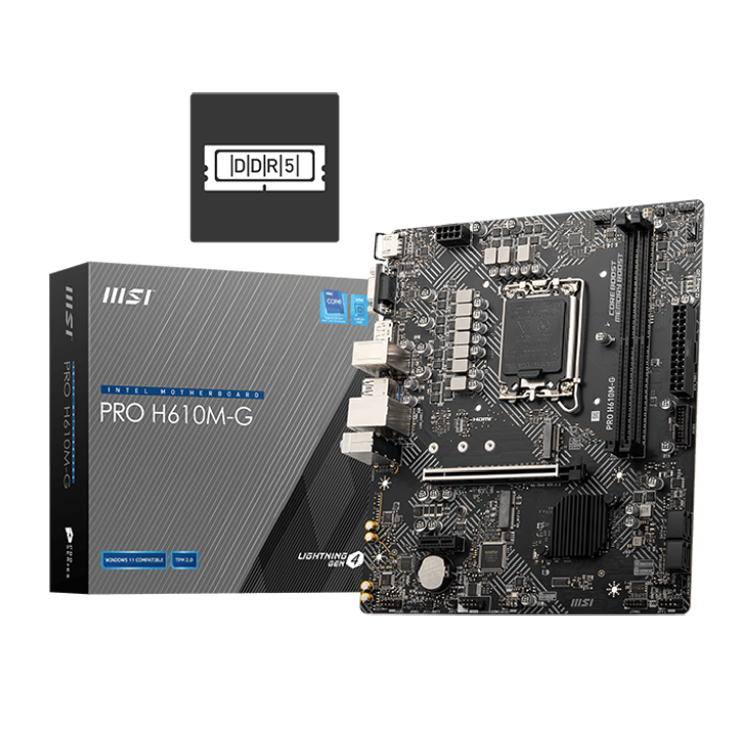The MSI PRO H610M-G DDR5 is a budget-friendly, micro-ATX motherboard built around the Intel H610 chipset. It’s aimed at general desktop, multimedia, office, and light gaming builds, offering the essentials you need without premium extras.